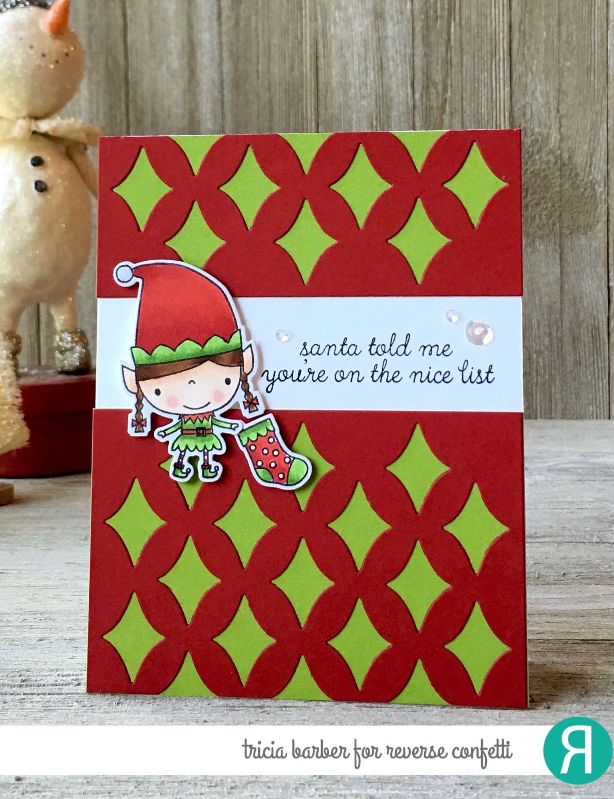 I stamped the elf image from the Christmas Cheer stamp set on Premier Polar White cardstock and colored with Copic Markers. I layered my die cut panel on top of a white card base and then stamped my sentiment in the cut out area.