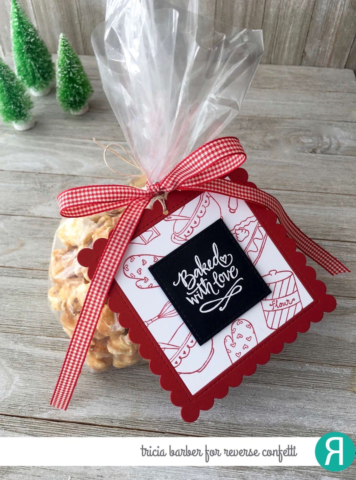 For my last project today, I made a tag to use for homemade treats at Christmas using the Kitchen Love stamp set.   I stamped the images using Brick ink on white cardstock and then die cut the white cardstock and some Brick cardstock with the Scalloped Squares Confetti Cuts.