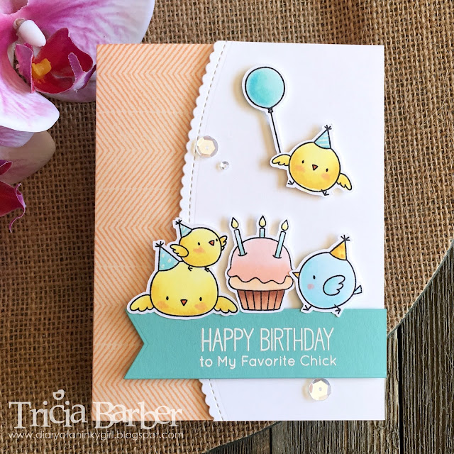 Happy Saturday to you!   Last weekend, we went on a quick trip and to craft on the go, I decide to stamp out some stamps sets that I had not been able to ink up yet and take them with me for some coloring on the go.   One of the stamps that I took with me was this one from My Favorite Things called Birthday Chicks.   I loved these little bird images and the cards from the Design Team were so much fun that I could not resist this stamp set.    So with my stamped out images, I made three cards.