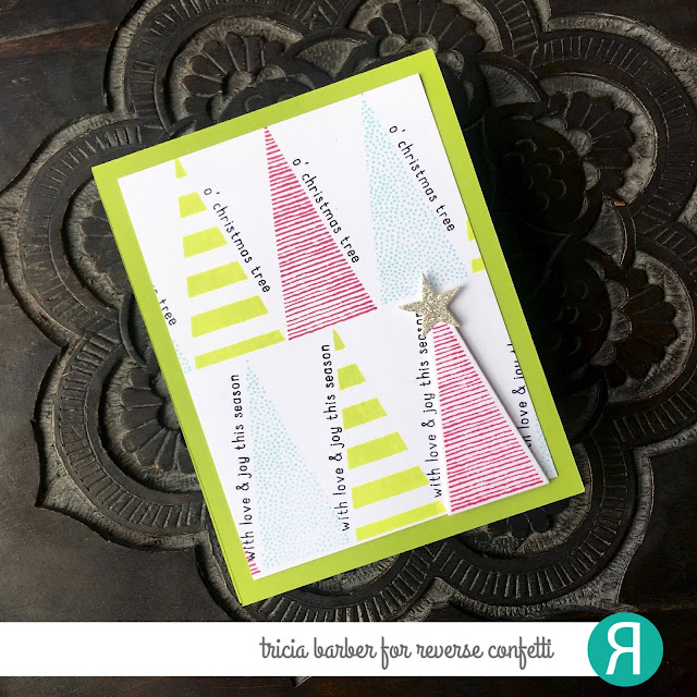 Hey!  I am popping in to share a trio of cards that I made for Christmas using the Triangle Trees Stamp set from Reverse Confetti.   I created several background using the trees and the same ink colors: Rose, Parakeet, Lagoon, Piggy Bank and Iced Aqua.