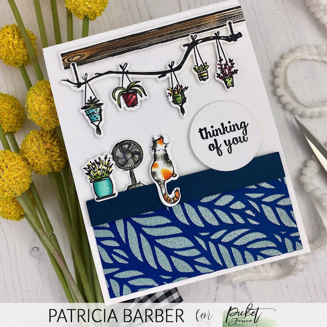 For my first project - I created a scene card. I just love making scene cards. The stamp set is called a Window Seat to the World. It has some great images. I stamped out all the images and colored with my Copic markers. I die cut the images out with the coordinating Window Seat to the World die. I love all the tiny little images that you can use to create multiple different projects. For the base of my card, I wanted it to appear like wallpaper and used the new Shadow of Leaves stencil and Paper Glaze Luxe in Spanish Moss. How beautiful is that glaze! It has a ton of sparkle! So smooth and thick - easy to work with and clean up! I added a small navy stripe and then added my sentiment. I love the branch with the hanging potted plants and the little calico kitty!